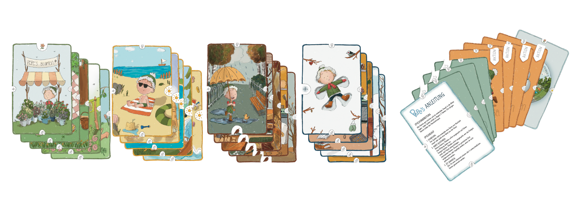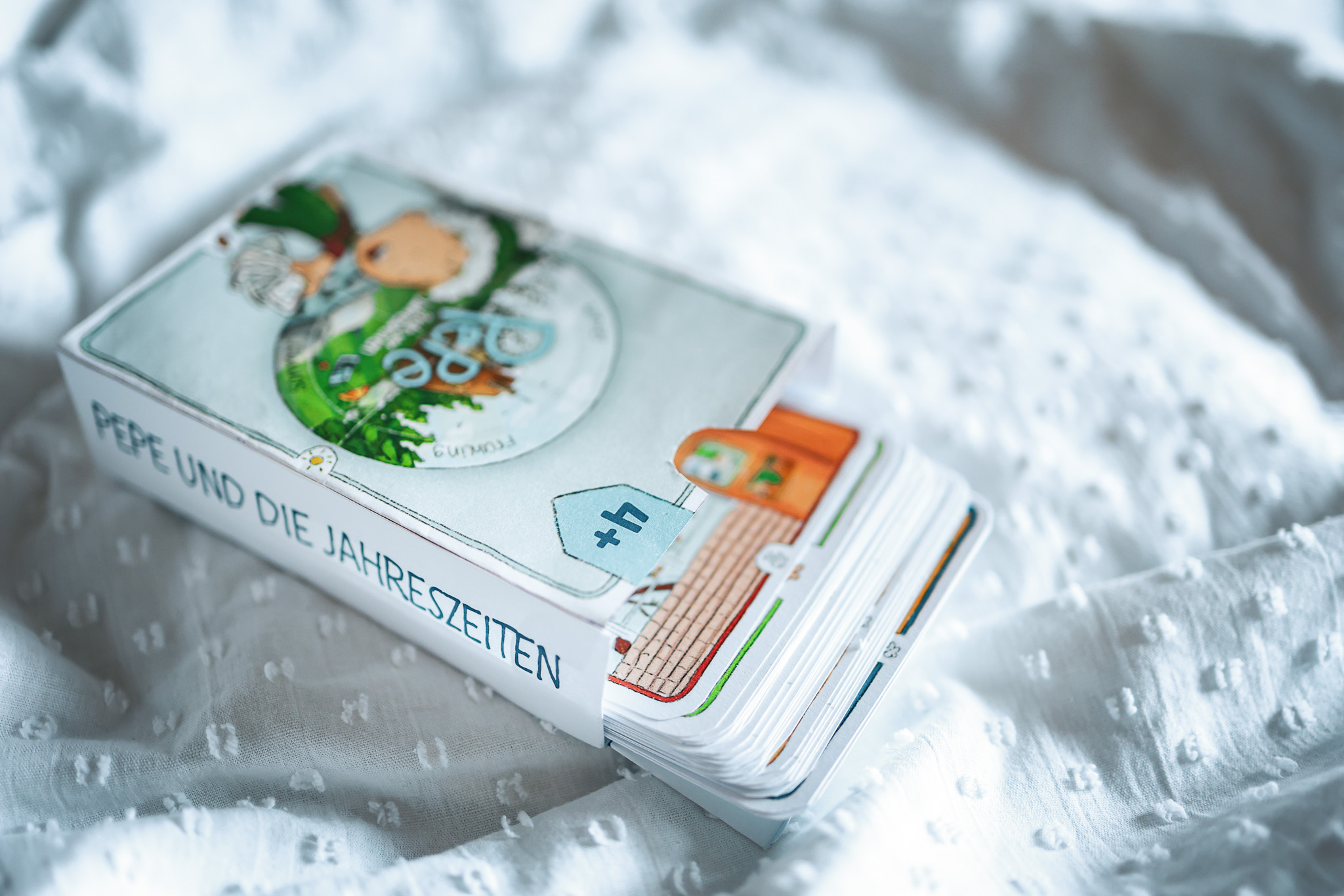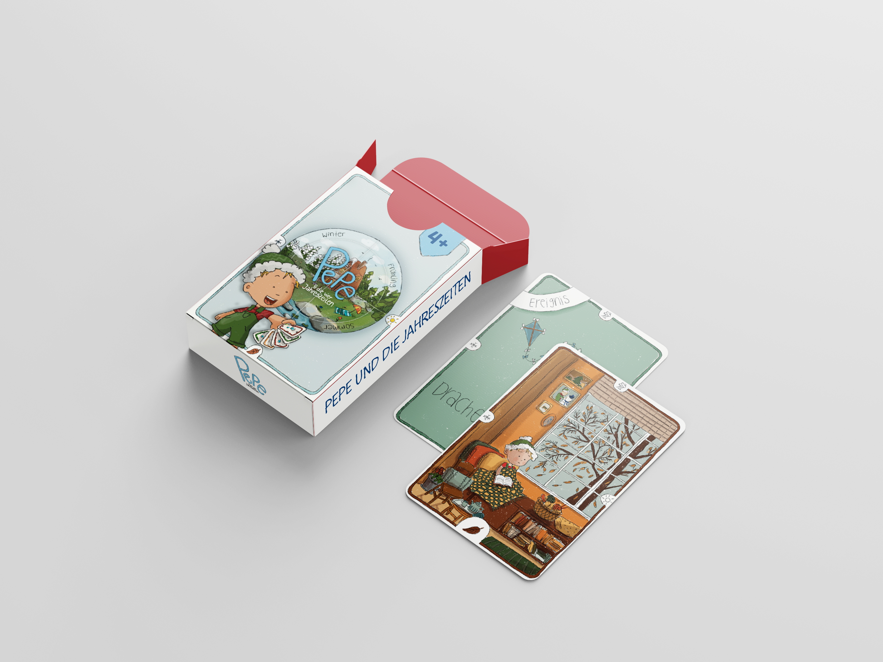 „Pepe und die Vierjahreszeiten“ knüpft an das Kinderbuch an und ist ein Sammelkartenspiel, bei dem Spieler durch geschicktes Tauschen, Raten und Nutzen von Aktionskarten versuchen, ein vollständiges Set aus fünf unterschiedlichen Karten einer Jahreszeit zu sammeln. Ereigniskarten mit Pepe-Motiven sorgen für interaktive Ratespiele, während Aktionskarten das Spielgeschehen beeinflussen. Wer als Erster ein vollständiges Jahreszeiten-Set besitzt, gewinnt die Partie!